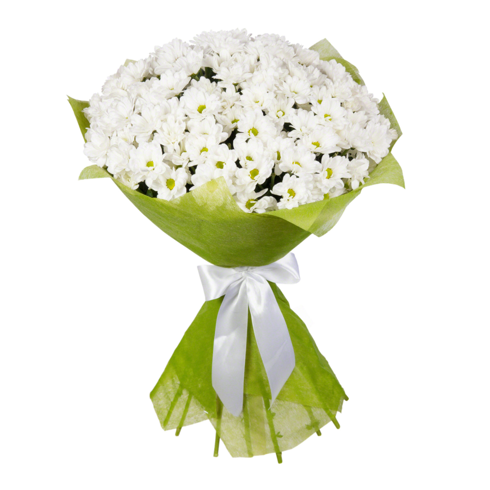 Роскошный букет из свежих хризантем в стильной фетровой упаковке — воплощение утонченного вкуса.