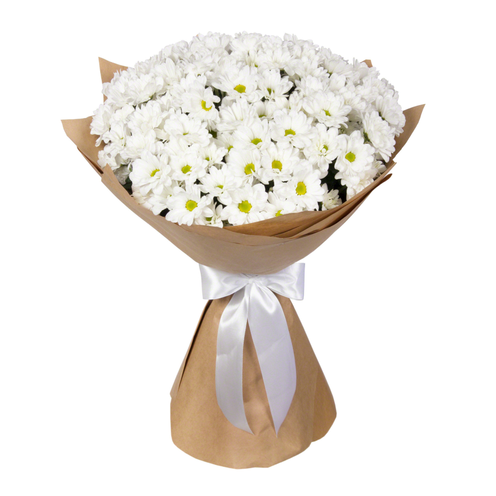 Пышный букет из 21 хризантемы в крафт-бумаге – элегантность в каждом лепестке